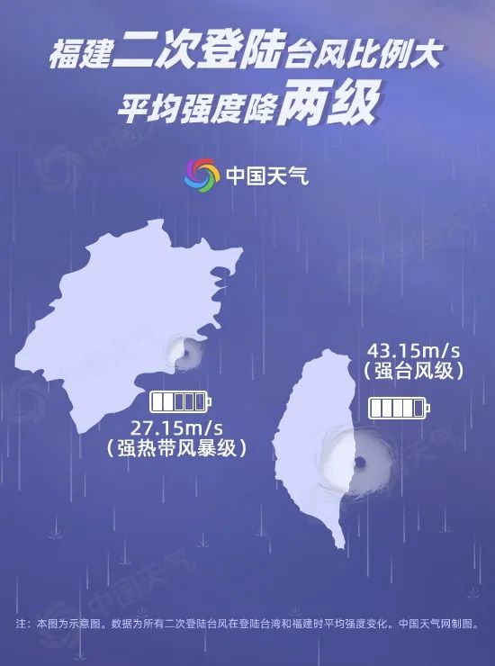 从地理位置上看,登陆福建的台风很难绕开台湾。中国天气网盘点1949年以来的气象大数据发现,112个登陆福建的台风中,近七成是先登陆台湾再登陆福建的。这些台风在二次登陆福建时,强度会出现明显衰减,平均强度连降两级,由43.15米/秒(强台风级)降至27.15米/秒(强热带风暴级)。